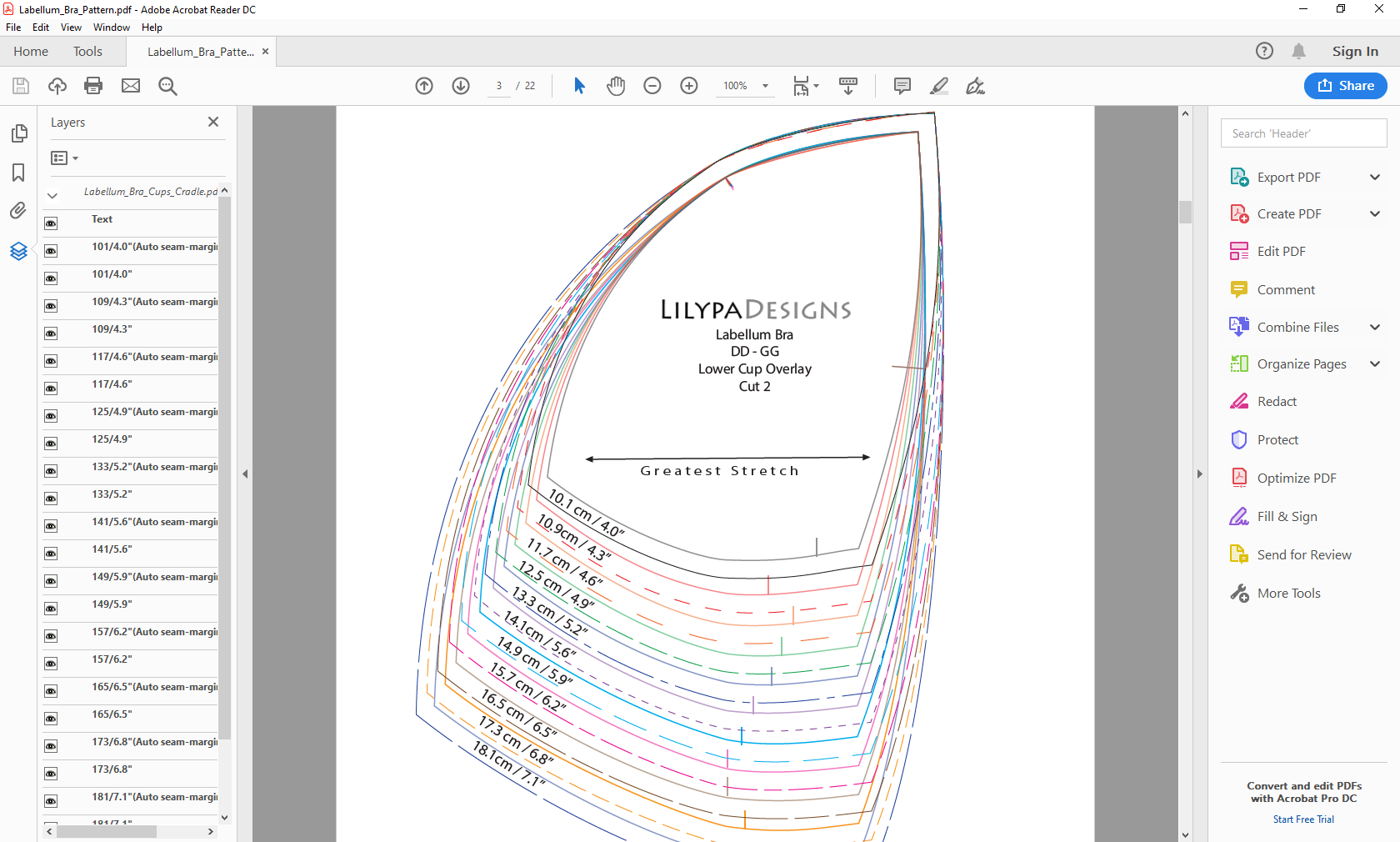 That said, we wanted to cover ONE method of increasing/decreasing the bottom cup depth (BCD) of the cups in detail and utilizing the “Layers” option in Adobe Reader. For those who are not aware, Adobe Reader is a FREE PDF Reader that is a bit more robust. The ability to turn on/off different sizes and/or seam allowance can make grading and customizing easier. While this tutorial was written for the Labellum specifically, the methods can be applied to any multi-pieced bra cup.