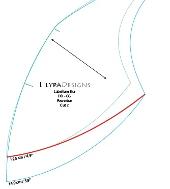 In our previous sample [HERE], Heidi’s best fitting underwire fits 13.3cm/5.2” while her Horizontal Hemisphere (HH) is 14.9cm/5.9” and BCD is 12.5cm/4.9”. This means she needs the volume of the larger HH but a shorter BCD. We can accommodate that by reducing the BCD of the 14.9cm/5.9” to 12.5cm/4.9”.