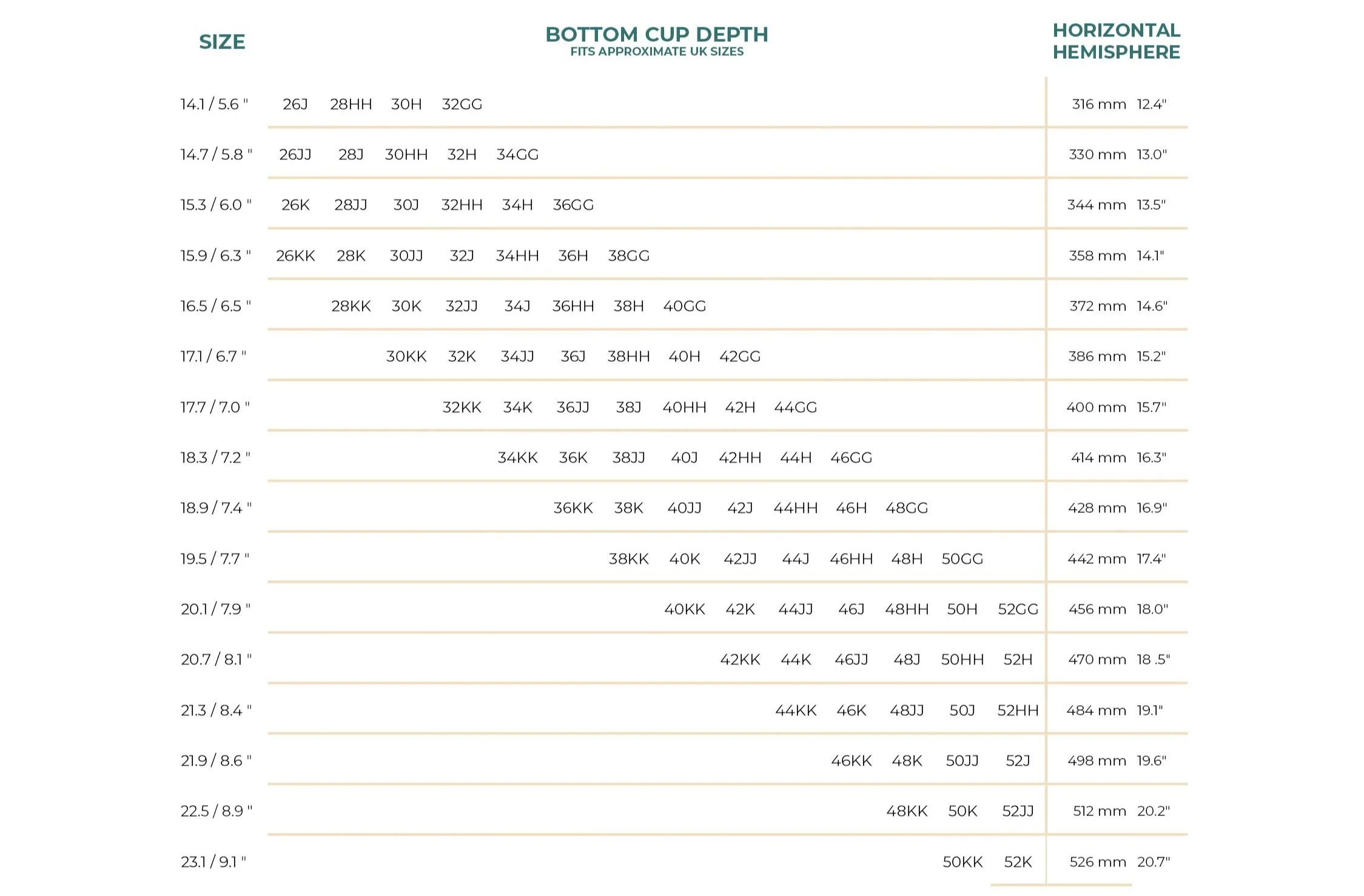 This pattern uses UK bra sizing, bottom cup depth, and horizontal hemisphere measurements for more accuracy. Please use the size that corresponds to your horizontal hemisphere measurements rather than your RTW size.